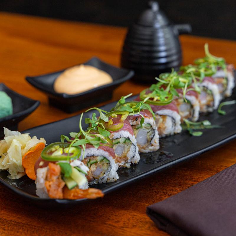 Yellowtail sashimi, sliced jalapeno, ginger, scallion with yuzu ponzu & hot EVOO